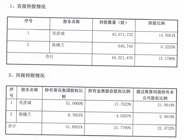 截至目前,关彦斌直接持有葵花药业股权4367.17万股,持股比例为14.96%。同时,关彦斌持有葵花集团51.09%股权、金葵股份17.75%股权,划算下来,关彦斌间接持有葵花药业股权比例为21.9914%。以葵花药业12日收盘价30.74元估算,关彦斌直接和间接持股市值达33亿元。
