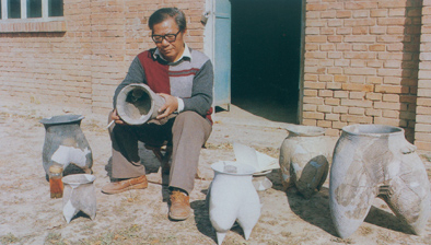 ▲张忠培1990年在山西省太谷县白燕村工地库房观察陶鬲。(图片由张晓悟提供)