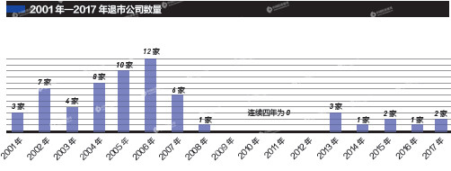 从各年的退市情况看,2001年有3家上市公司退市,2002年增加到7家,2003年为4家。此后逐年增加,2006年有12家公司退市,成为17年中退市最多的一年;接下来,退市的脚步慢了下来,2007年为6家,2008年仅1家,2009—2012年连续4年零退市;2013—2016年分别有3家、1家、2家、1家公司退市,2017年以来有2家公司退市或进入退市程序。