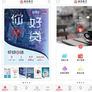 南京银行手机银行APP打开是宣传界面,右滑为主界面,再次右滑可以看到总资产信息及信用卡信息;界面风格清新简洁但操作略显复杂。主界面采用九宫格样式,可以自主设置快捷功能,但最多只能添加6个,且不能调整顺序。值得注意的是,南京银行APP某些常用功能不能“一步到位”,比如,交易查询需要点击“账户查询”—“交易查询”,信用卡还款则需要三步到位。主界面下方菜单栏麦克风图标可以进行功能搜索,并且支持语音搜索,比较遗憾的是不可以模糊搜索。