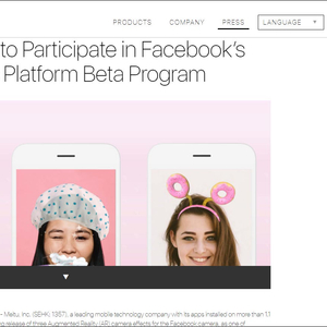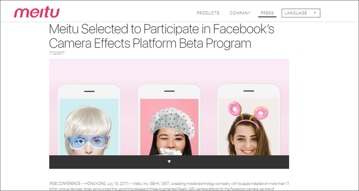 7月12日,美图官网发布公告称,美图成为Facebook AR工作室Beta早期测试版首家合作伙伴,为其提供三款AR相机特效。