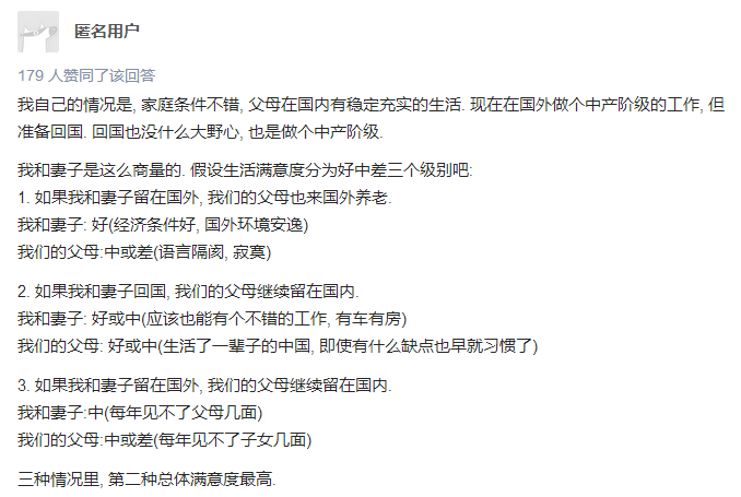 还有的认为自己的小家一定要把父母算上才能算作完整的大家,所以家庭也是回国因素的重中之重: