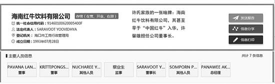 1993年7月,许书标早已在海南海口设立海南红牛饮料有限公司(简称海南公司),两年后,红牛维他命已正式设立,而海南公司依旧留存至今。在“红牛中国”的官网上,海南海口虽被列为红牛在中国的五大生产基地之一,究其所有权,其实一直是许氏家族的资产,许馨雄个人持股60%,担任董事长。