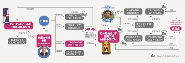 红牛维他命饮料有限公司(下文简称“红牛维他命”)是此番涉及商标使用许可纠纷的公司之一,也是两方利益交错的核心点。这间公司通常意义上被认为是中国红牛的主体公司,由许氏家族的红牛维他命饮料(泰国)有限公司控股,但董事长一职由严彬担任。