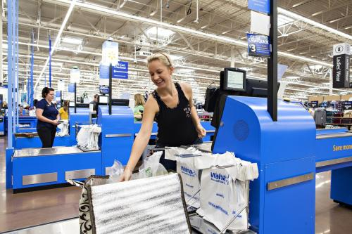 沃尔玛收银台用自助结账通道取代收银员。(来源:华尔街日报)