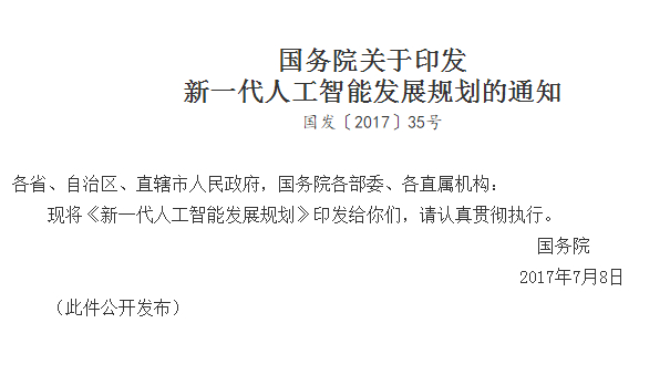 中国网财经7月20日讯 国务院近日印发《新一代人工智能发展规划》(以下简称《规划》),提出了面向2030年我国新一代人工智能发展的指导思想、战略目标、重点任务和保障措施,部署构筑我国人工智能发展的先发优势,加快建设创新型国家和世界科技强国。