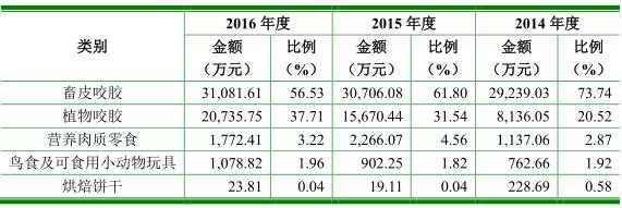 据招股书显示,公司主要从事宠物食品的研发、生产和销售,主要产品为畜皮咬胶、植物咬胶、营养肉质零食、鸟食及可食用小动物玩具、烘焙饼干等系列产品。