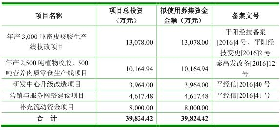 佩蒂股份本次募集资金净额39,824.42万元用于年产 3,000 吨畜皮咬胶生产线技改项目、年产 2,500 吨植物咬胶、500吨营养肉质零食生产线项目、研发中心升级改造项目、营销与服务网络建设项目、补充流动资金项目。其中8000万元用于补充流动资金项目。