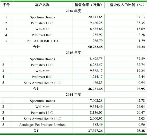 招股书显示,公司的主要客户为 Spectrum Brands、Petmatrix、Wal-Mart 等名企业。2013-2016 年,公司前五大客户合计销售额占当期营业收入的比例分别为 95.10%、93.28%、92.95%和 92.24%。