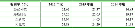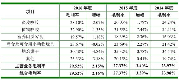 公司称,2014 年度至 2016 年度,公司毛利率高于同行业可比公司平均值,主要是由于目前尚无与发行人从事完全同类产品的公司,选择的可比公司在产品种类、客户群体、销售市场等方面均与发行人有所不同。大北农、金新农的主要产品为猪饲料,而公司产品系宠物食品范畴内的宠物零食,且主要外销至美国、加拿大及欧盟国家,产品品质的要求相对更高,并且在研发环节需要针对宠物在口味方面可能存在的各种需求,调节其产品的适口性、口味、耐咬性,并附加除口臭、增强免疫力等功能,技术含量及产品附加值相对较高,其毛利率也相应较高。
