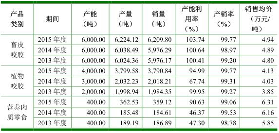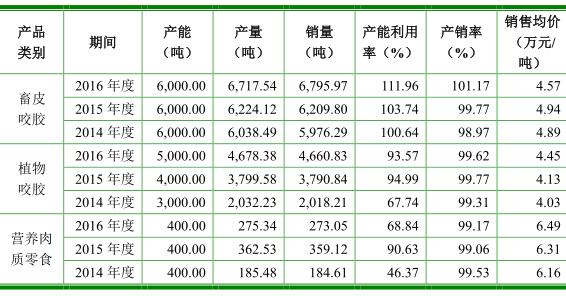 2013-2016年,公司畜皮咬胶产能利用率分别为100.04%、100.64%、103.74%、111.96%。,植物咬胶产能利用率分别为99.95%、67.74%、94.99%、93.57%。,营养肉质零食产能利用率分别为47.30%、46.37%、90.63%、68.84%。