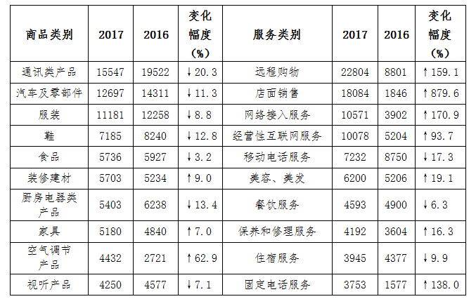 投诉量居前十位的商品和服务(单位:件)