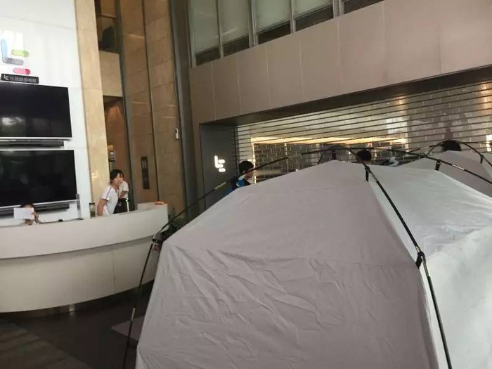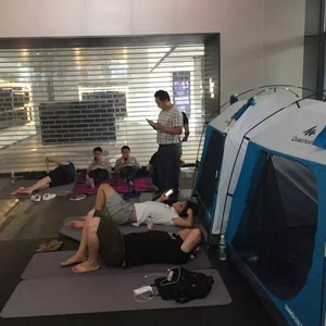 为了缩减维权成本,有供应商在乐视大厦的大厅内搭起了帐篷,铺上了垫子。他们穿着拖鞋,横七竖八的躺在大堂内;用喇叭重复高声播放“乐视还钱!贾跃亭还钱!”的录音。