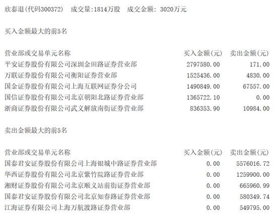 欣泰退今日迎来退市整理期首次开板,盘中多次涨停,尾盘有所回落,截至收盘,欣泰退涨6.83%,报1.72元,全天成交18.14万手,换手率达18.37%,成交金额为3020万元,成交量明显放大。据龙虎榜数据显示,欣泰退今日买卖前五都是券商营业部,平安证券深圳金田路证券营业部279.76万元,买入金额最多,占全天成交额的9.27%,万联证券衡阳营业部买入152.54万元,国金证券上海互联网证券分公司买入149.08万元,国信证券北京朝阳北路营业部买入136.57万元,浙商证券武义解放南街营业部83.64万元。卖出方面,国泰君安上海银城中路营业部卖出557.60万元,卖出金额最多,华西证券北京紫竹院路营业部卖出125.99万元,剩下三大券商营业部卖出金额均不不超过100万元。