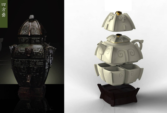 图为“四羊方罍”茶壶组合,左侧为原文物,右侧为创意茶壶产品