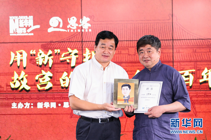 图为新华网董事长、总裁田舒斌为单霁翔颁发思客高级顾问证书并赠送漫画。新华网记者 陈竞超摄