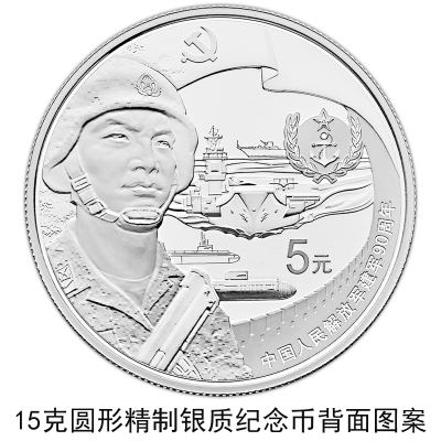 15克圆形银质纪念币背面图案之二为党旗下的海军军人形象配以典型武器装备、军兵种臂章图案、长城造型等组合设计,并刊“中国人民解放军建军90周年”字样及面额。