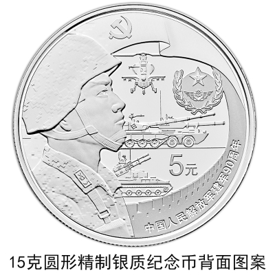 15克圆形银质纪念币背面图案之一为党旗下的陆军军人形象配以典型武器装备、军兵种臂章图案、长城造型等组合设计,并刊“中国人民解放军建军90周年”字样及面额。