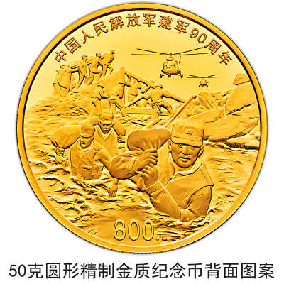50克圆形金质纪念币背面图案为解放军官兵和武警官兵抢险救灾场景,并刊“中国人民解放军建军90周年”字样及面额。