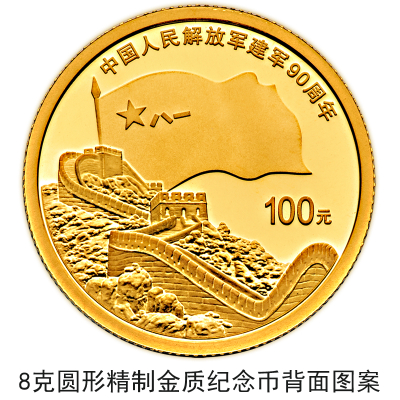 8克圆形金质纪念币背面图案为军旗、长城造型组合设计,并刊“中国人民解放军建军90周年”字样及面额。