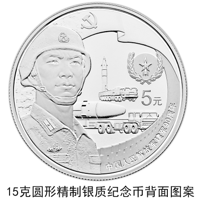 15克圆形银质纪念币背面图案之四为党旗下的火箭军军人形象配以典型武器装备、军兵种臂章图案、长城造型等组合设计,并刊“中国人民解放军建军90周年”字样及面额。