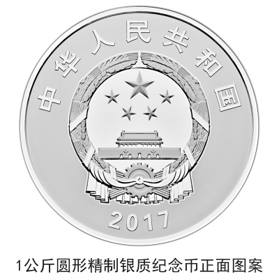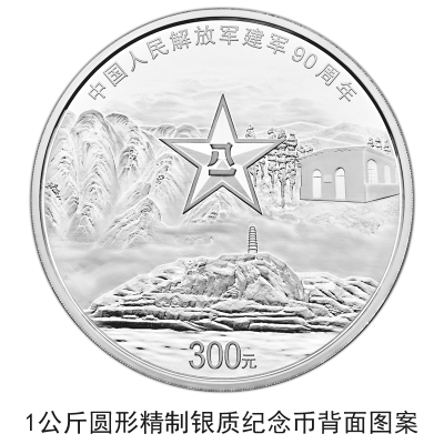 1公斤圆形银质纪念币背面图案为八一军徽配以井冈山、延安宝塔山、西柏坡典型造型组合设计,并刊“中国人民解放军建军90周年”字样及面额。