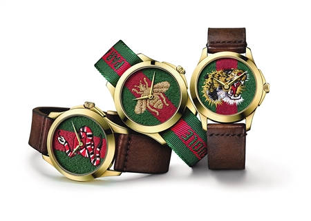 GUCCI 该系列表款风格多样,其中两款腕表搭配柔软的Toscano棕色小牛皮表带,尽显简约复古魅力。