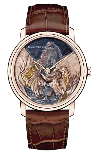 宝珀 宝珀经典系列“双牛争王”主题孤品腕表,18K红金表壳,鳄鱼皮表带。
