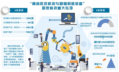 为了夯实我国的工业之基,缩小我国数控机床领域与国际上的差距,2009年,我国正式启动实施“高档数控机床与基础制造装备”国家科技重大专项。8年多来,专项取得了丰硕成果,新增产值约706亿元,我国高端数控机床技术水平不断提高,重点领域国产制造装备生产制造支撑强劲有力,高档数控机床实现了国产化突围。