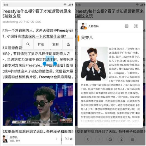 MIUI9传送门是小米全新打造的黑科技效率神器,任何文字区域长按一下,立即传送回智能结果,目前可以支持人物百科、影视剧、商户等多维度信息查询和推荐。互动百科拥有1600万百科词条,致力于为数亿中文用户免费提供海量、全面、及时的百科信息。此次精选了30余万条的人物百科数据,涵盖了明星人物,历史人物,新闻人物,政治人物,体育人物等各个领域,助力“传送门”功能。小米的用户更新手机系统至MIUI9后,在微信聊天,浏览新闻等诸多场景下,对于看到的人物名称进行长按,即可在页面底部看到互动百科提供的人物百科卡片,点击卡片即可看到人物详细信息的预览。