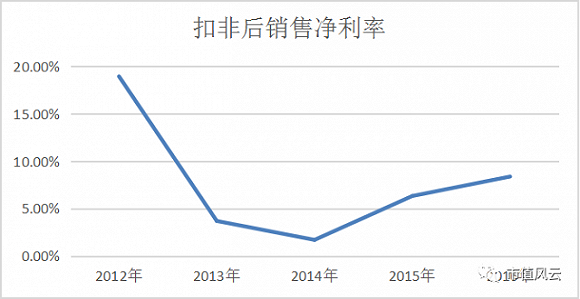再来看看扣非后净利润。2012年上市的时候,其扣非后净利为3.29亿,到2016年时,扣非净利只有2.9亿,辛辛苦苦发展了5年,圈了近80亿,盈利能力还不如上市之前。