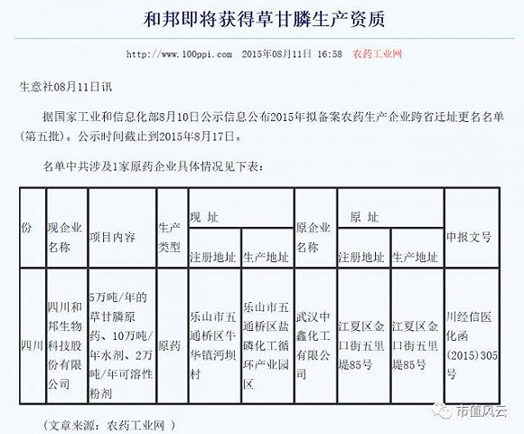看过这则信息也许大家就明白了,和邦看上中鑫化工的,主要还是这个草甘膦生产资质!