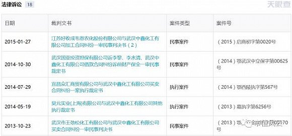 在上面这些官司当中,中鑫化工涉及拖欠货款(王劲松化工、昊元实业、宜昌众汇商贸、好收成韦恩农化、兴达集团)、拖欠工程款(赤东建设集团)、拖欠银行贷款(中国银行)、借高利贷(武汉国亚)等。
