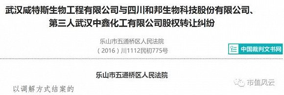 另一个是2016年,武汉威特斯生物工程有限公司与四川和邦生物科技股份有限公司、第三人武汉中鑫化工有限公司股权转让纠纷一案,这个案子也是庭外和解,看以下截图: