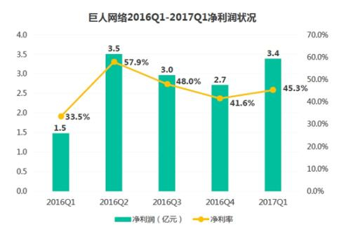巨人网络营业收入呈现稳步上升,2017Q1营业收入同比增长率达到68.8%,其主要原因为巨人网络在移动游戏领域持续发力,例如推出《征途手机版》,释放端游IP“征途”在移动游戏领域的价值,开启《球球大作战》商业化进程等。