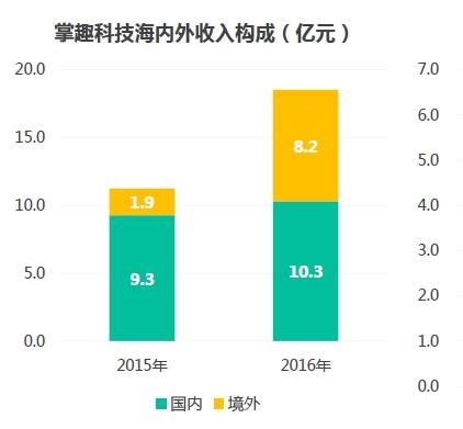 掌趣科技2016年海外收入大幅提升,达到8.2亿元,占总营收44.4%。掌趣科技通过与海外顶尖游戏公司展开合作,围绕IP授权、联合研发、代理发行等业务进行海外市场开拓。
