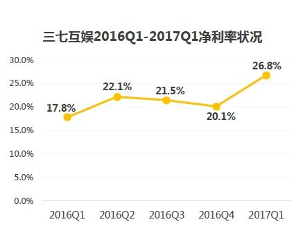 2016年三七互娱营收平稳增长,这得力于其手游业务的持续上升以及网页游戏的稳固表现。三七互娱2016Q1-2016Q4季度利润持续上涨,2017Q1净利润达到4.3亿,在所有上市游戏企业排名靠前。净利润率基本维持在20%以上,这是因为三七互娱部分产品为代理,需要给予研发商分成。