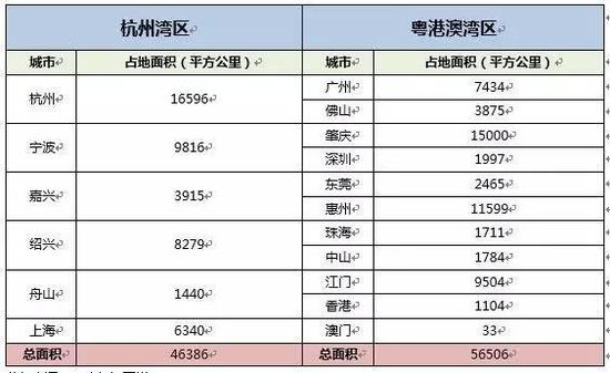 表2:杭州湾与粤港澳湾区域面积对比(单位:平方公里)