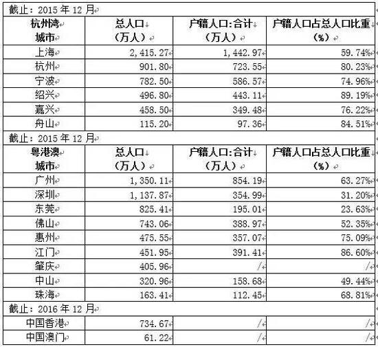 表1:杭州湾与粤港澳区域人口对比(单位:万人)