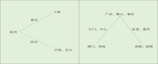 (图左是杭州湾地区各城市空间位置示意图,图右是粤港澳地区各城市空间位置示意图。)
