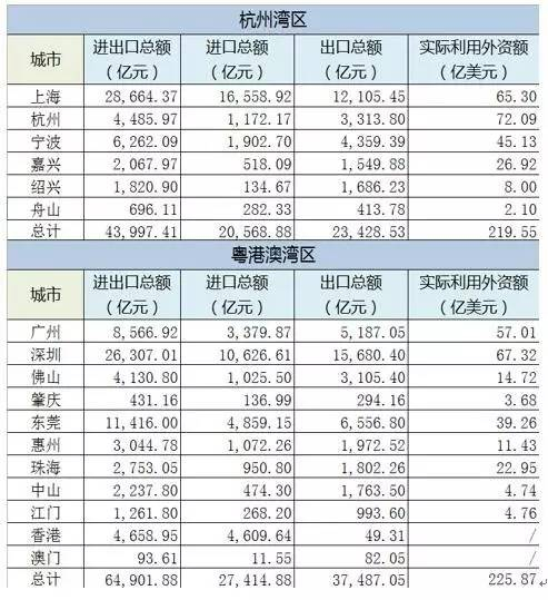 上文从地理形势、区域人口、湾区面积、经济指标、龙头企业、教育资源、港口效能以及交通运能等多个维度对标了以香港、广州、澳门为三个顶点的粤港澳大湾区和以上海、杭州、宁波为首的杭州湾区。