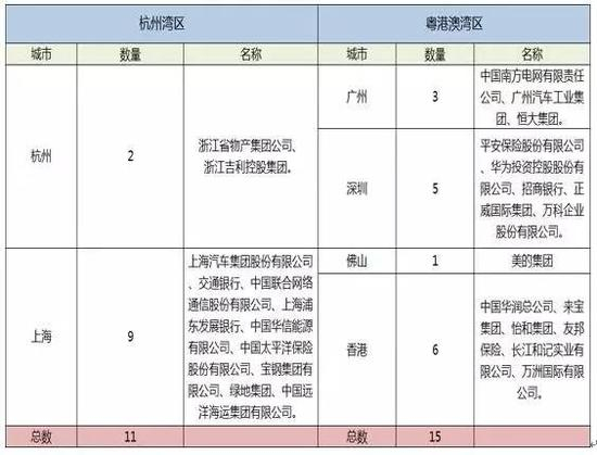 表6:杭州湾与粤港澳湾区世界500强企业对比