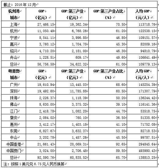 表3:杭州湾与粤港澳湾区国民经济数据对比1