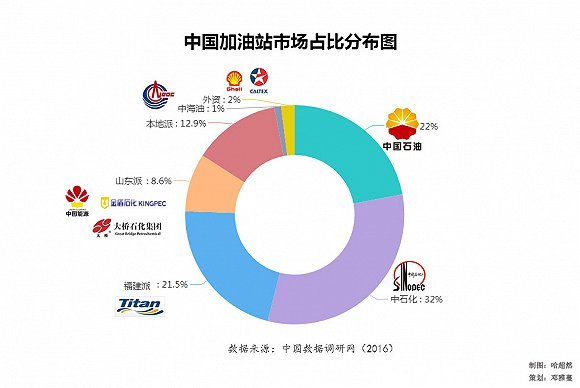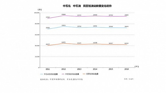 中国散布着约9.8万座加油站。2014年以来,民营加油站的数量保持在4.6万家左右,占全国加油站的四成多。截至2016年年底,中石化加油站数量增至3.06万座,约占中国加油站总量的三成;中石油加油站数量增至2.09万座,约占两成。