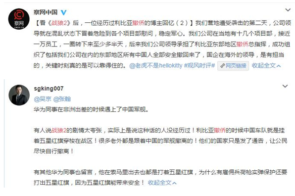 影片中,中国大使馆百般保护海外同胞,海军舰长大声怒吼“开火”,男主角单手撑着国旗带车队穿过交战区等细节,让不少观众热血沸腾,感动落泪。