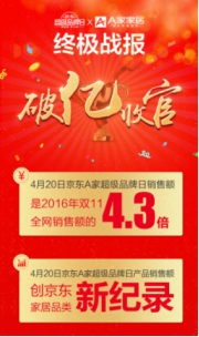 4月20日“京东超级品牌日·A家盛典”,让A家家具这个品牌创下了京东家居品类的销售新纪录;