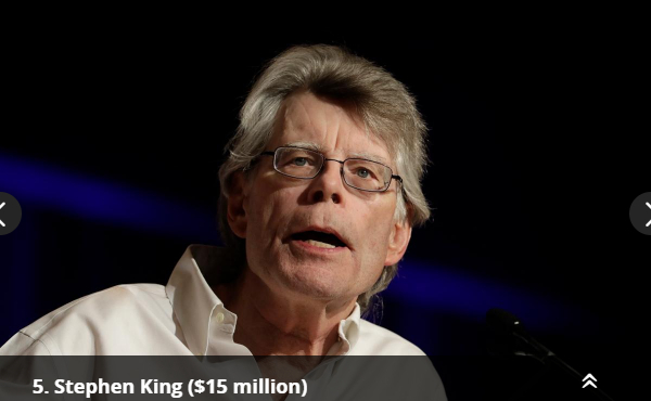 惊悚小说大师史蒂芬·金凭借其第55本新书《警戒结束》收入1500万美元,排名第五。《达芬奇密码》的作者丹·布朗(2000万美元)排名第四,《小屁孩日记》的作者杰夫·金尼(2100万美元)排名第三。排在第二位的是惊悚推理小说作家詹姆斯·帕特森。