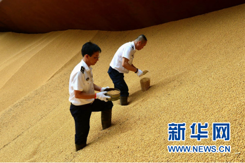 8月3日,在一艘停靠在广西防城港码头的巴西进口大豆船上,防城港出入境检验检疫局的工作人员在抽取大豆样品。新华社 李绚丽 摄