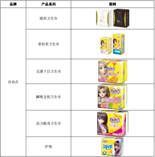 根据百亚股份招股书披露,目前公司的主营业务为卫生巾以及纸尿裤两大项目,其中卫生巾产品为“自由点”与“妮爽”两种。“自由点”品牌强调“自由”和“青春”的品牌理念,定位为中高端品牌。而“妮爽”品牌强调“清新”与“健康”的品牌理念,属于公司的大众品牌。