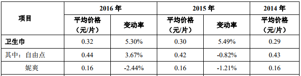1片卫生巾的成本是多少?招股书显示,上述两款卫生巾产品的平均价格整体呈上升趋势,2014到2016年,每片平均价格为0.29元、0.3元和0.32元。